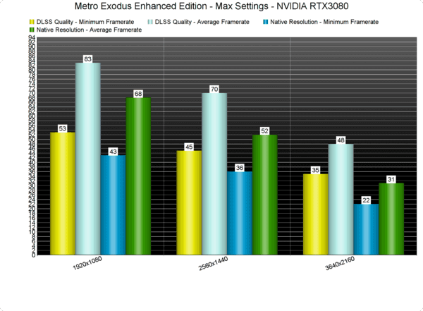 《地铁:离去 增强版》目前已经登陆了PC平台,且英伟达免费为游戏追加了DLSS 2.1、增强版光线追踪等功能,外媒DSOGaming在游戏上线同时也对本作的PC性能进行了分析测试,选用了Intel i9 9900K/16GB DDR4内存(3600Mhz)、NVIDIA RTX 3080显卡以及Windows 10 64位系统和GeForce 466.27驱动。