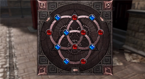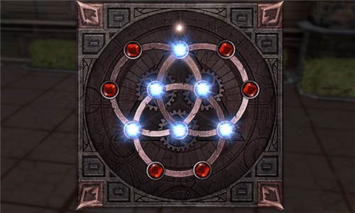 当蓝色宝石都在中间构成一个三角形,红色宝石都在三个圈圈的外围,就能解开这个机关谜题了。