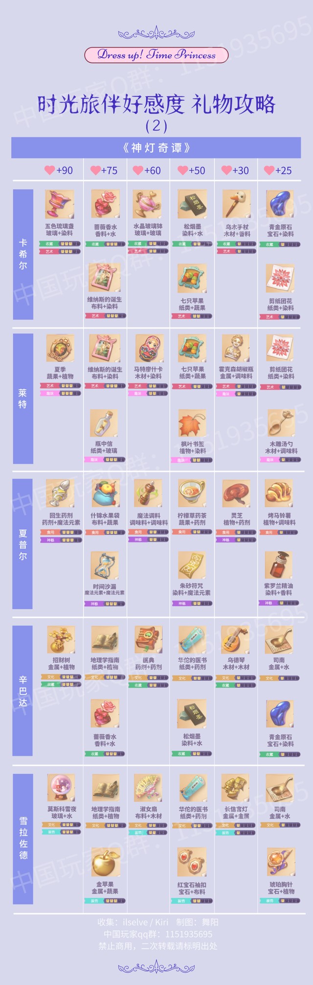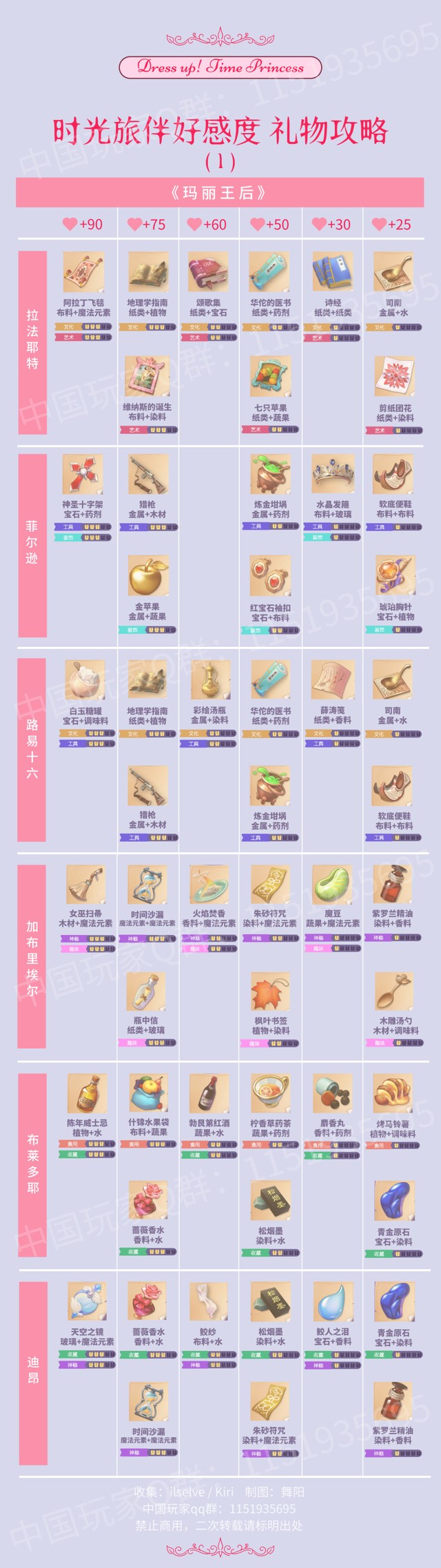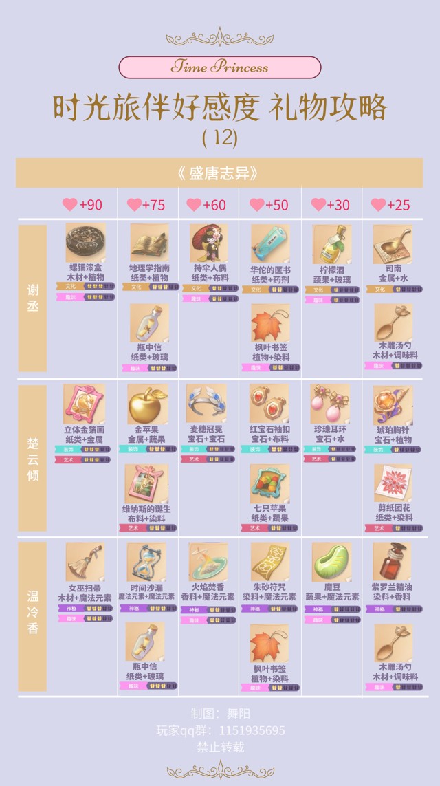 《时光公主》新手避坑攻略一、不要盲目送礼物!时光旅伴礼物共有105个,建议提早按照图表将所有礼物图纸都合成出来,早合早方便,毕竟所有故事通关都需要每个NPC 7级好感度。根据