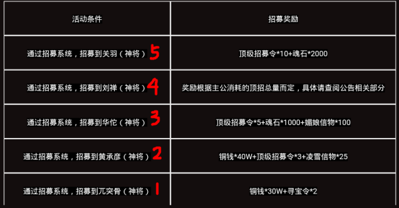 《塔王之王》招募攻略那在说到招募之前,有一些重要的基础知识想告诉萌新们~请看下图:这张就是每次活动时,活动招募武将的公示图。玩家可以通过游戏内右上角的公告获取信息