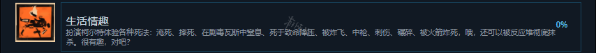 生活情趣是游戏中最特殊的一个成就,完成条件为:扮演柯尔特体验各种死法:淹死、摔死、在剧毒瓦斯中窒息、死于致命降压、被炸飞、中枪、刺伤、碾碎、被火箭炸死,被反应堆彻底抹杀。