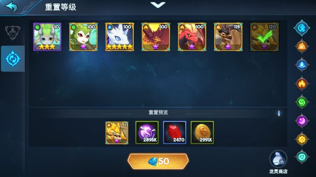 通过重置,小龙升级所用资源将会全部返还,而小龙重置为1级。这里注意哈,兄弟们,小龙60级以前随便重置,不耗钻石;60级以后,每次需要50钻石。