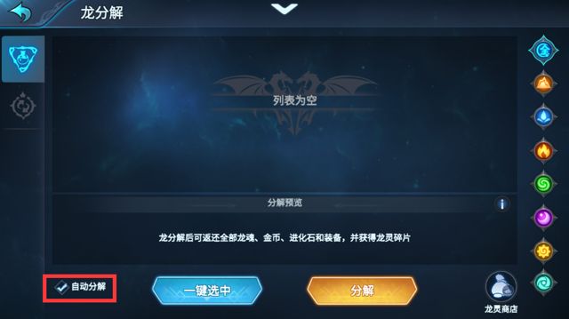 龙分解还有个功能,那个是真的“龙分解”,字面意思,分解一星龙崽子的。点击左下角自动分解后,每次你召唤出一星龙都会自动后台分解。
