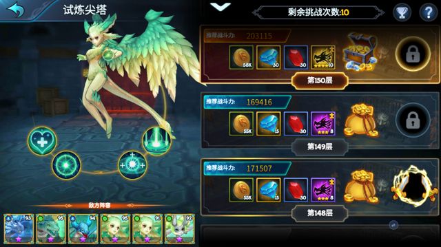 爬塔系统,每天有10次免费挑战机会,击败当前敌人获得通关奖励并升至下一层。