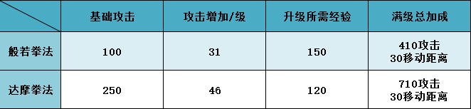 尽量外功内功双满级(增加容错)。此时抛开个人属性不谈,敌我气血5层洗髓经与7层降龙伏虎功基本持平(要是满级大概还多对面千血);攻击方面亲传弟子武器是蓝武30+五层达摩拳=510、我方紫武40+满级般若拳410=450,同时拳法满级额外增加30的移动距离。