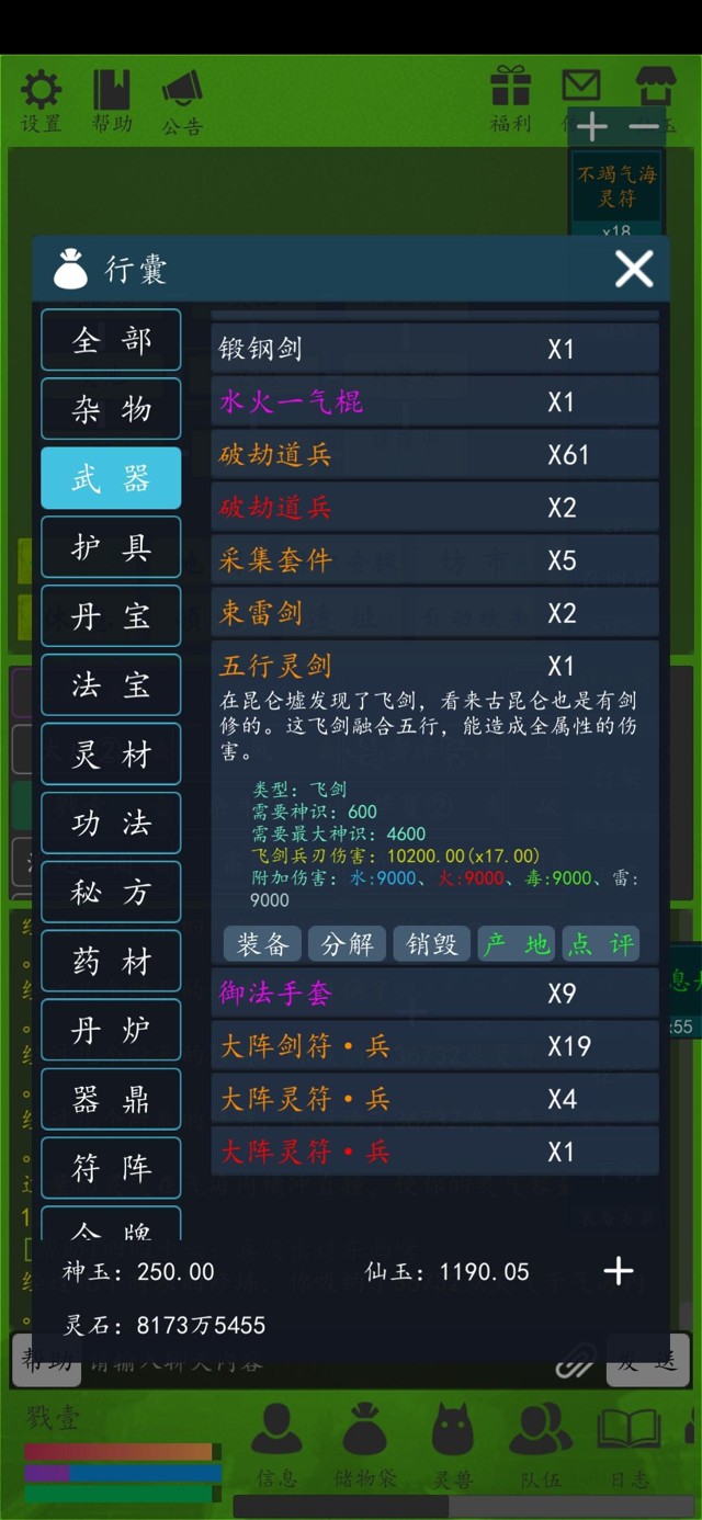 兵伤功法 六妙印法御剑术御灵术庚金真解上下神魔破天诀(追求极限可以拉满,正常来讲天道不多可以先放着,天道花的多加成不多)太元剑诀残章(主要攻击技能太元剑诀)