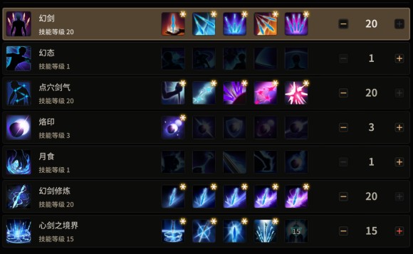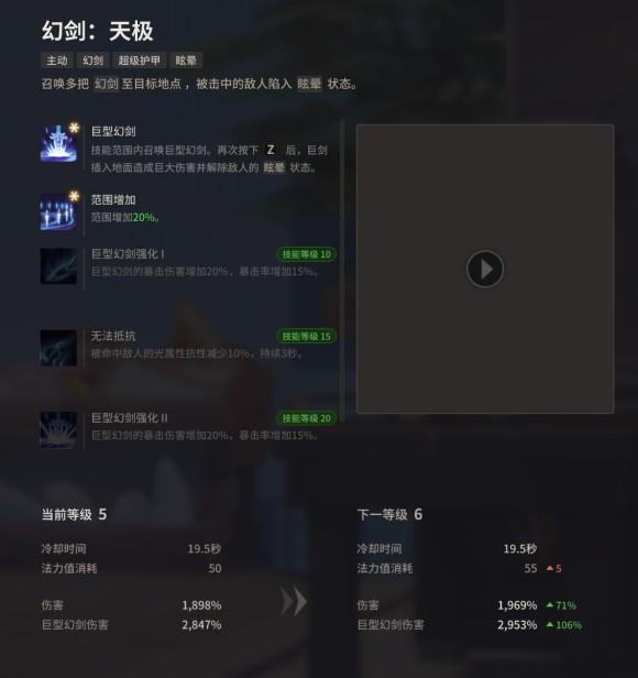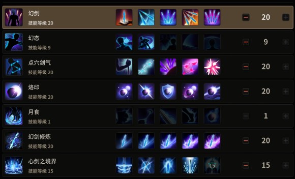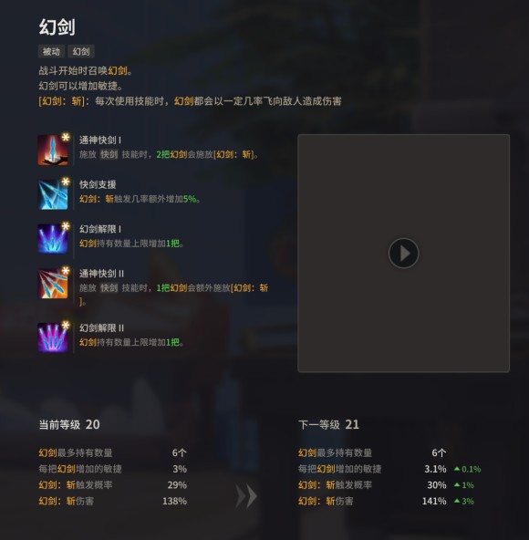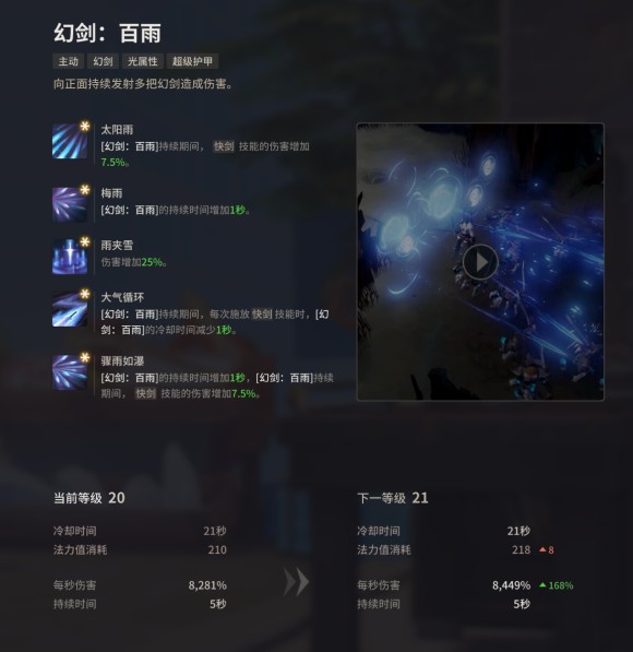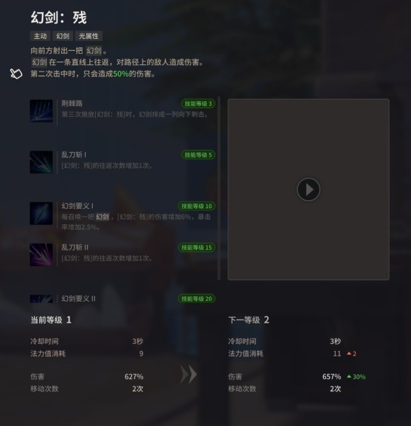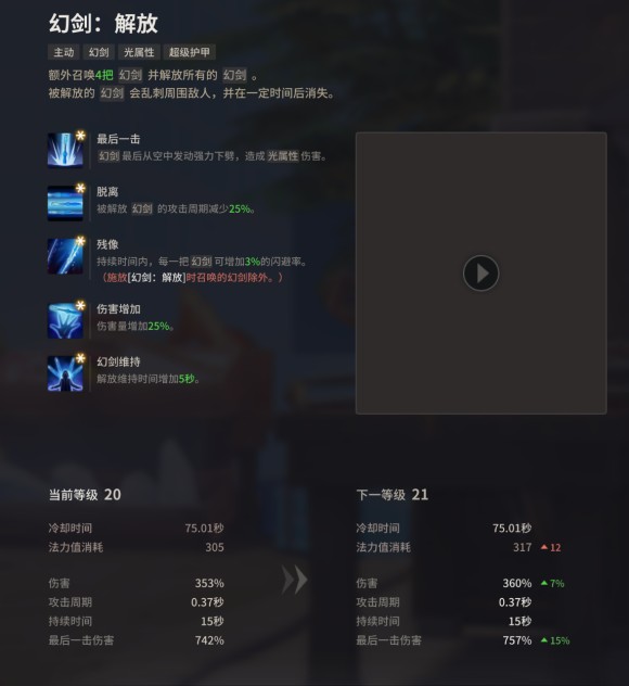该技能使用后总共会召唤10把幻剑,如果按照技能描述的攻击周期级百分比,那么累计伤害将是一个非常恐怖的数值,但在实战效果中攻击周期与技能描述存在偏差,以及幻剑会随机攻击目标导致伤害分散,并没有特别夸张的伤害量。技能本身是幻剑加光属性,也会吃到许多加成效果,总体来说也是一个非常优秀的脱手输出技能。建议加满。