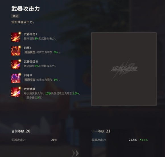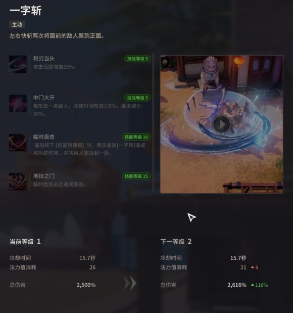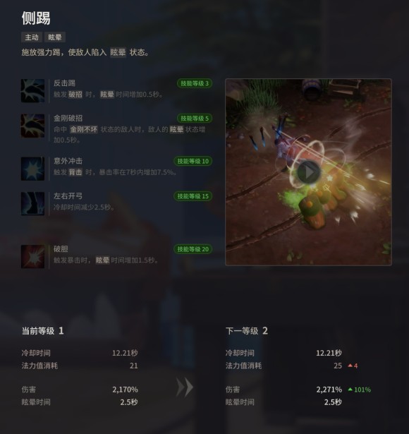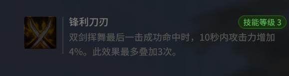 和许多主动技能特效挂钩,是必学的技能,但加满性价比不高,和三级比仅有不到10%的加成。建议3级点出层数增加。