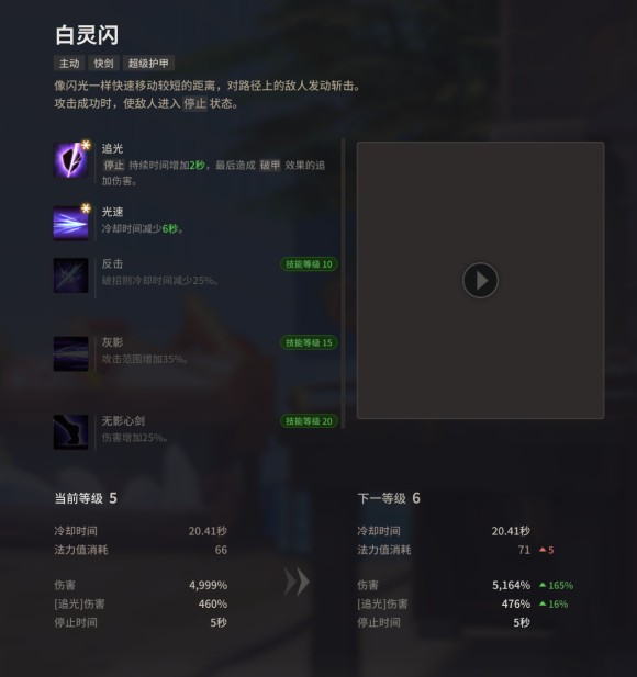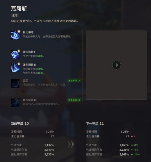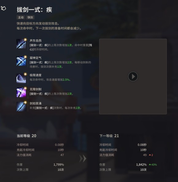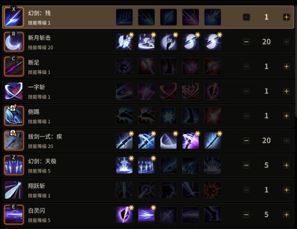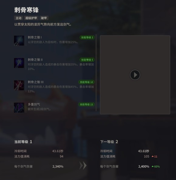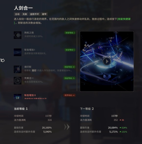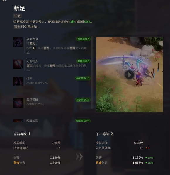 练级路上最爱的技能,首先该技能是幻剑属性,意味着点到5级可以稳定触发被动【烙印】的特效,加上超短的cd使用起来非常灵活,但后续阶段技能效果比较拉垮,加上较低的百分比,点满性价比不高,后期可以舍弃。建议5级点出折返或不加。