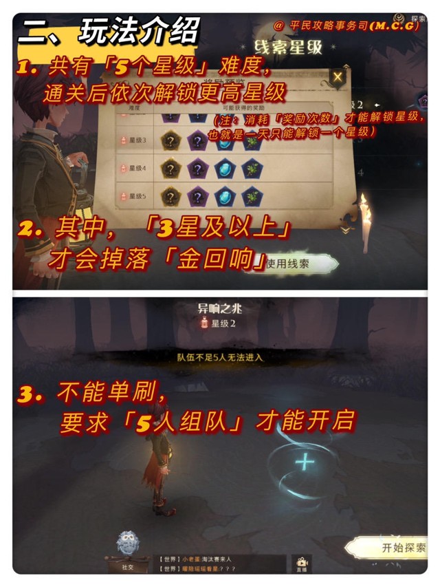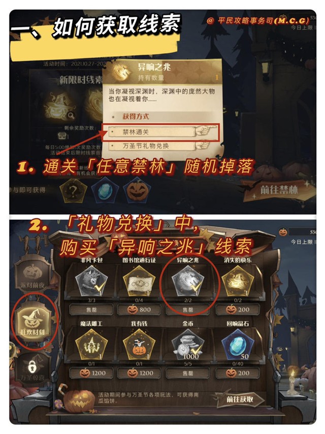 《哈利波特魔法觉醒》异响之兆金色禁林攻略一、如何获取线索:1 在万圣节活动期间,通关「任意禁林」有概率掉落线索;2 通过「礼物兑换」中的第二层礼品,购买「异响之兆」线索;