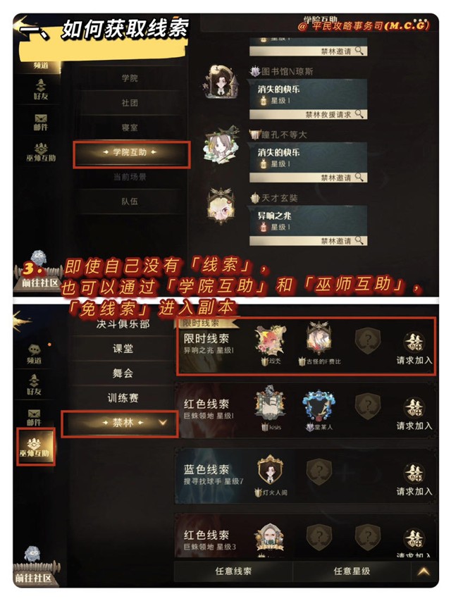 3. 即使没有自己没有「线索」,也可以通过「学院互助」和「巫师互助」,「免线索」进入副本。