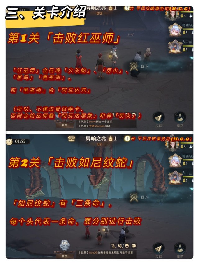 (1)第1关:「击败红巫师」。「红巫师」会召唤「火灰蛇」、「厉火」、「黑鸟」、「黑巫师」,而「黑巫师」会「阿瓦达咒」。