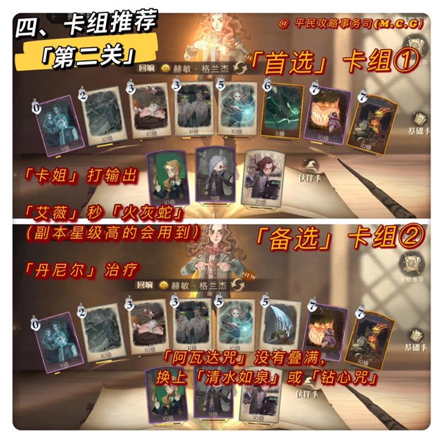 (二)第二关一套「首选」卡组,一套「备选」卡组。如果「第一关」没有叠满阿瓦达层数,则换上「清水如泉」或「钻心咒」;