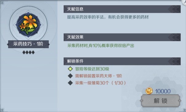 解锁冒险天赋包括四个条件:冒险等级、前置天赋、对应材料、金币,天赋解锁后,消耗材料和金币可继续升级。其中,解锁材料可通过野外和据点采集获得,也可直接金币快捷购买,机关大师、药剂大师、铁匠大师等匠人类天赋升级时需要完成对应的打造任务。