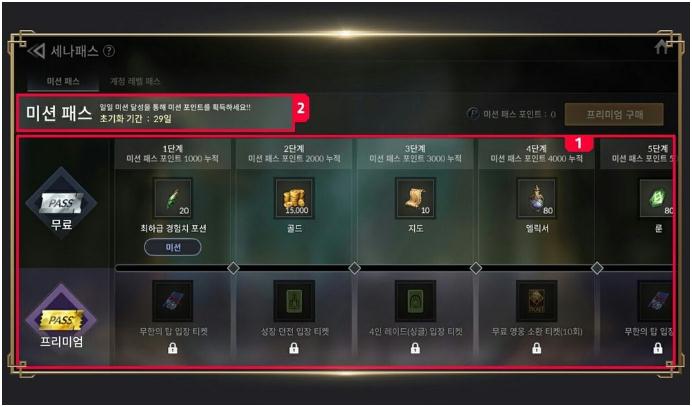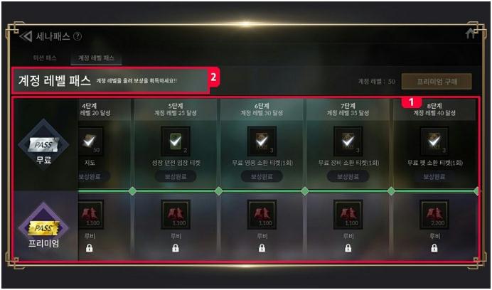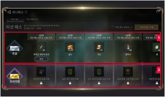 Sena Pass分为Mission Pass和Account Level Pass。