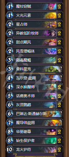 前中期通过各类低费牌进行过渡,7到8费开始进行谢幕或者龙火的超展开,鹦鹉持续把特大场面的节奏拉满,解完一波还有数波。