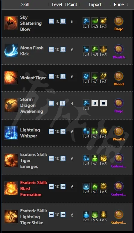由于前期没有高级的丰富符文(Wealth)更没有三脚架加持,能量的获取速度并不快,因此选择三奥义的加点,后期有金紫色丰富符文 + 回能量技能三脚架 的情况下,可以把 Violent Tiger 换成 龙卷风 (三脚架选 3-1-1)来增加自己的输出。