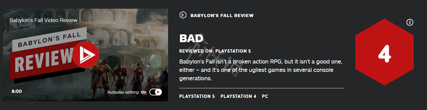 巴比伦的陨落是由se出品的多人合作动作RPG,近期ign也为这款游戏打出了相应的分数,具体如下。