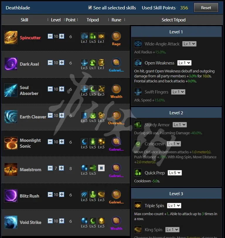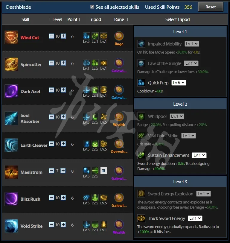 多利用小龙卷WindCat的持续能力,多刷点爆刀层数。VoidStrike不一定要蓄满才放,它的重点跟小龙卷一样,要他的那个地板残留攻击,主要还是拿来叠层数。BlitzRush跟SoulAbsorber是刀锋的两个主力技能,尽量把三脚架拉满。前期技能点不够,可以把EarthCleaver点到4级,它主要是拿来打虚弱跟反制的,顺便补点伤害跟突进。