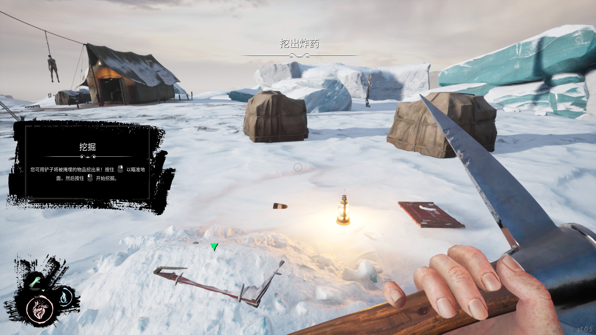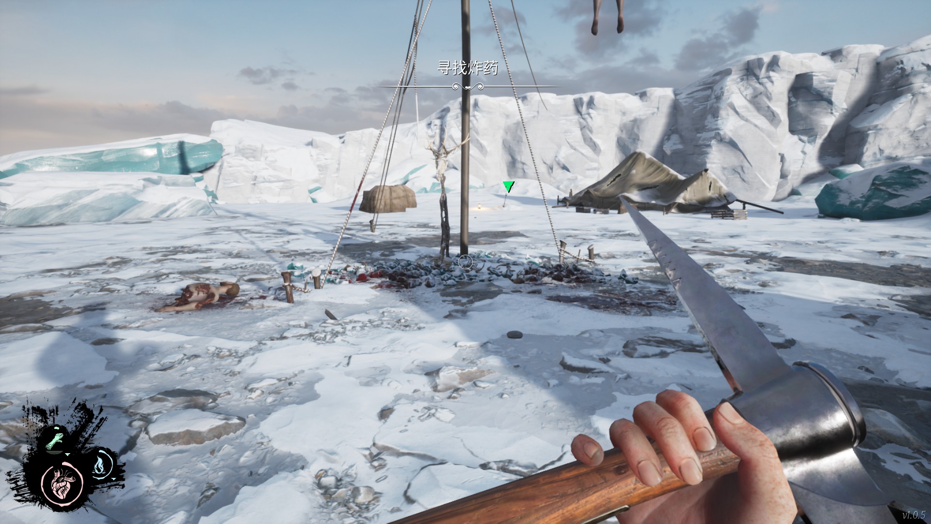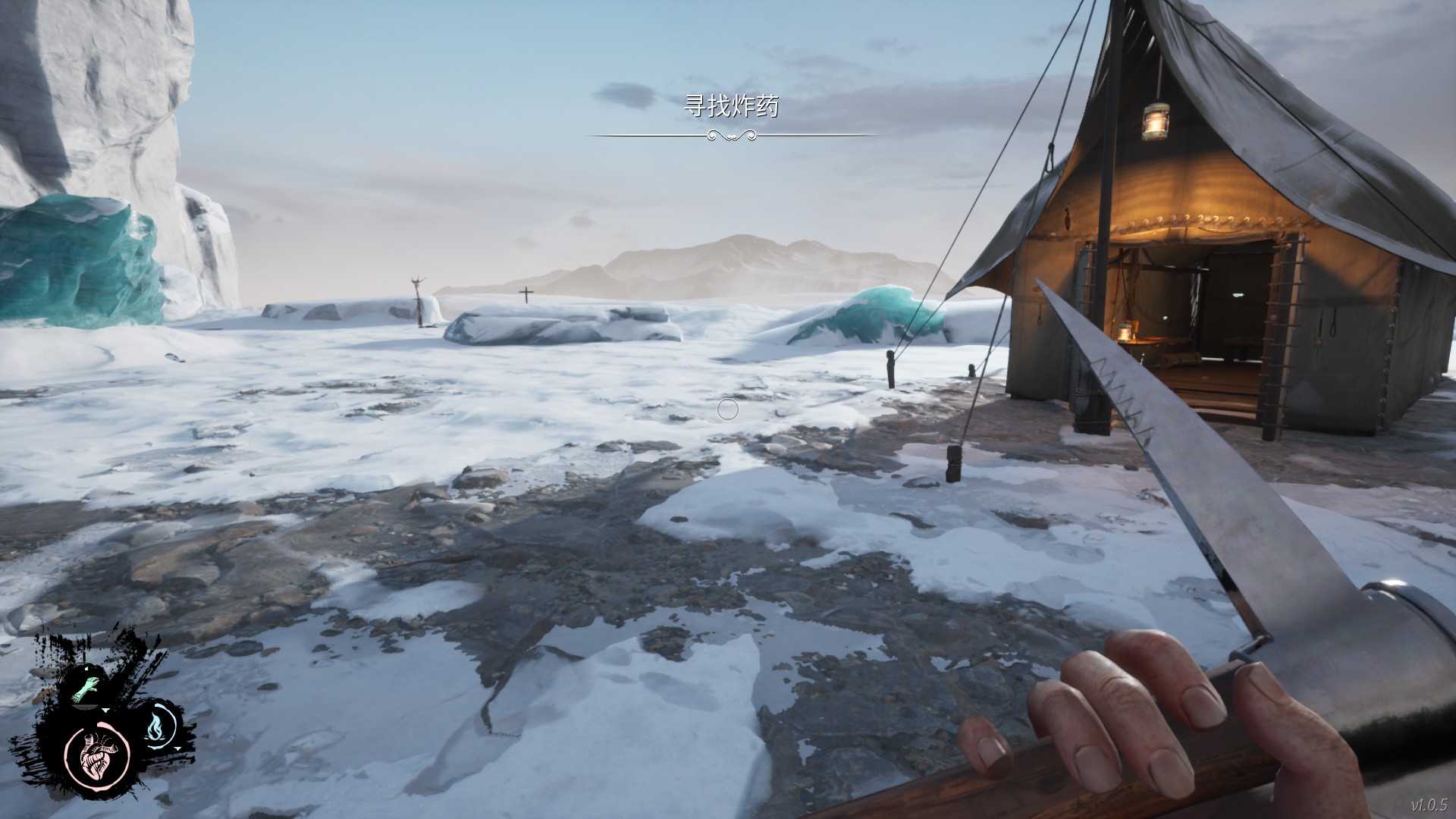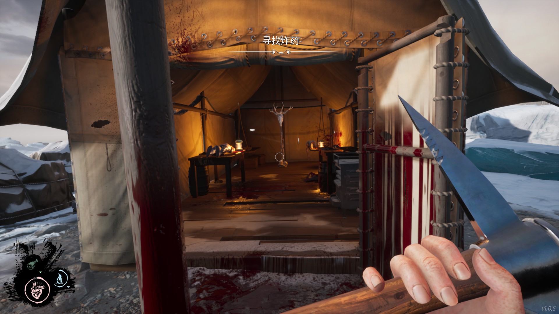 接下来我们经过白雾来到有炸药的营地处,营地周围一共是有四处图腾的。分别在: