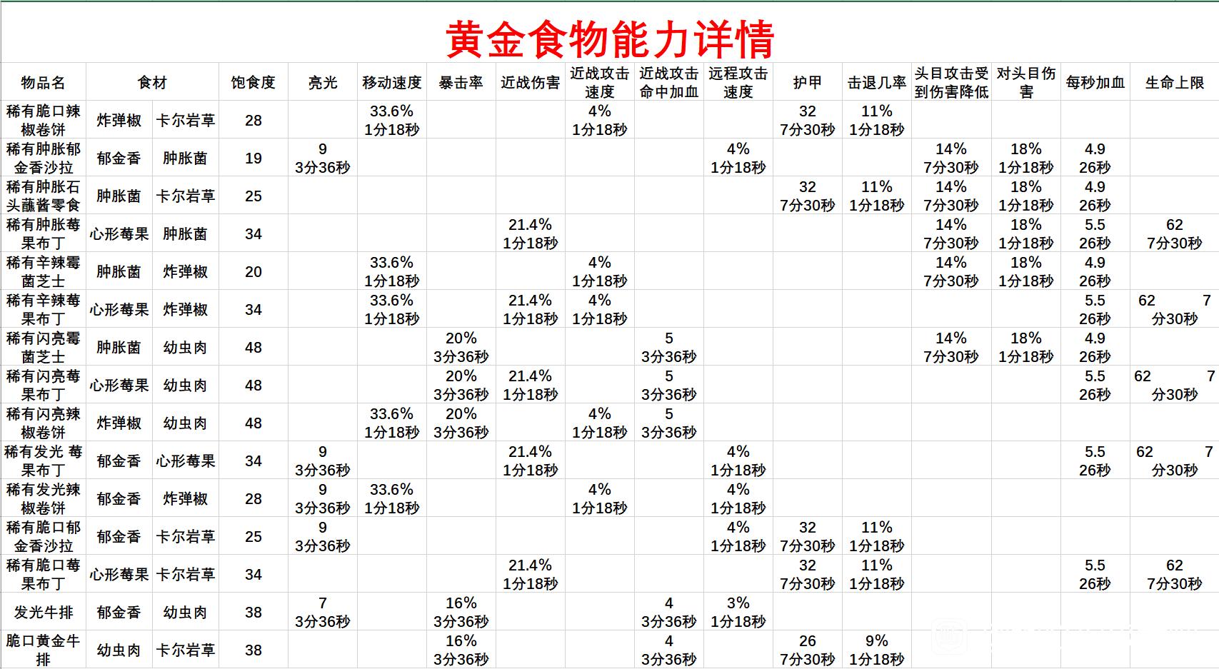 最后两个牛排数值低是因为是绿色食物,虽然用的是金色材料,而且以上这些并不是最高数值,烹饪技能点满以后会有几率开出更高级食物,而且几率不低,建议趁现在bug还没修复赶紧做一些你以后用的上的。