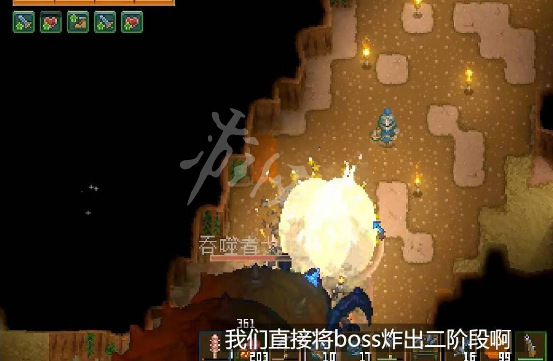 我们先在吞噬者戈尔姆会经过的地方先用铲子把地上的史莱姆凝胶铲掉(至少铲出一段能让你沿着内环自由行走的路),以至于不会长时间受到地面粘液-50%移速的debuff。