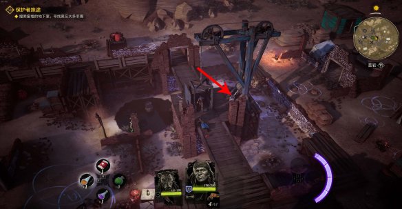 之后乘坐升降机到矿洞,往洞穴里面走,如图找到一个底下有红色矿车的高坡跳上去。