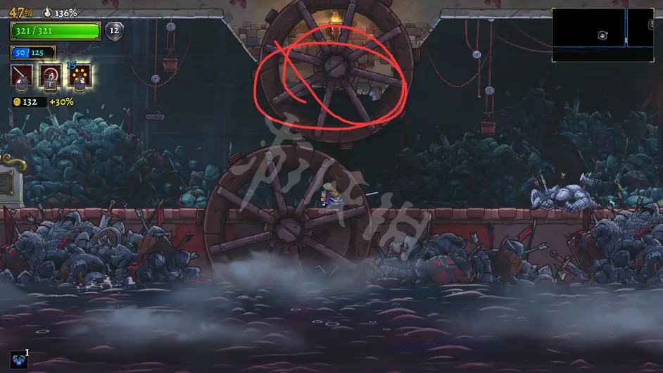 第二关boss的增伤,在boss的入口,水车轮组上面。