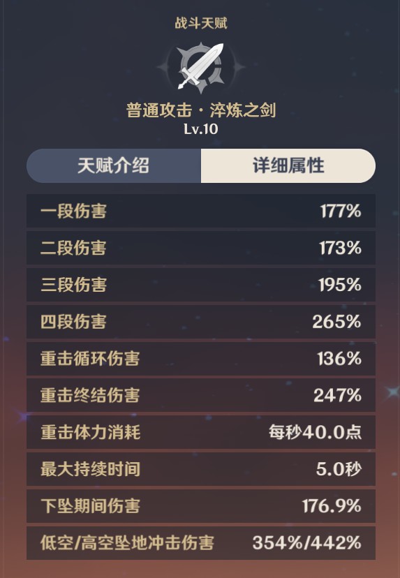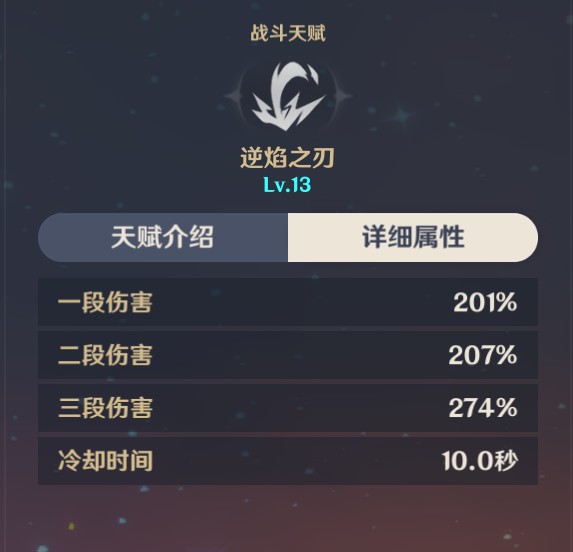 迪卢克的普攻分四段,其中第四段普攻倍率虽然很高,但前后摇太大,没有6命的情况下一般是不考虑使用的。使用大招后可给普攻带来火元素附魔,迪卢克的主要输出手段就是附魔后的普攻。因此普攻是迪卢克的主要加点天赋。