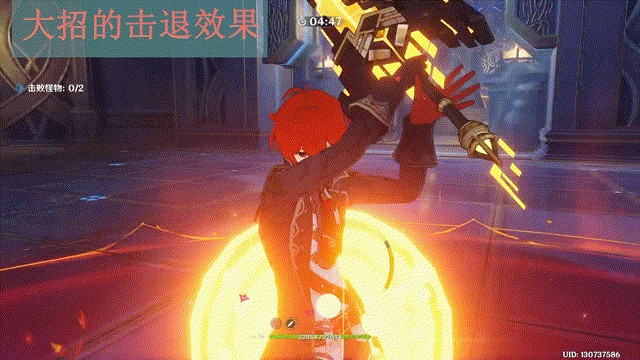 迪卢克开大时会先产生一个很强的气场,具有极高的削韧效果,大招能将体型较小的敌人直接推开。因为该气场具有削韧效果,是可以直接触发莫娜大招的,以及对矿物有削减效果。