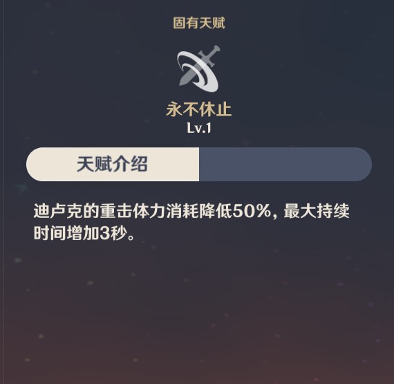 效果:迪卢克受到伤害时,攻击力提升10%,攻击速度提升5%,持续10秒。该效果至多叠加3层,每1.5秒只能触发一次。