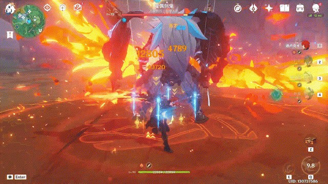 大招的伤害分为三部分:初始的斩击伤害、火之鸟飞行过程的持续伤害,以及行进结束时的爆裂伤害。三种伤害共享内置CD,但一般情况下也就只有初始的斩击伤害能打出反应,后续的伤害或是命中不到敌人,或是被推太远了挂不上水元素,很难打出反应。大招动画时间2秒,火之鸟飞行时间也约2秒。