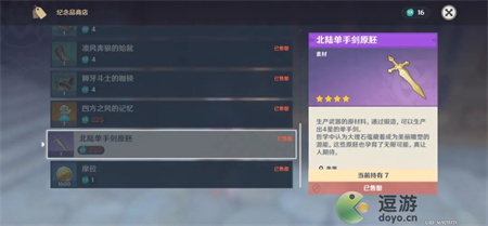 2.可在蒙德城内的“荣光之风”购买一个北陆单手剑原胚。