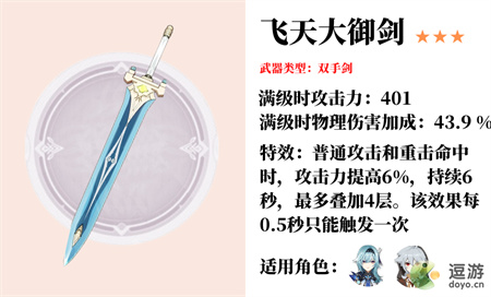 ①物理伤害加成43.9%,位居全双手剑第一!因为物伤泛用性高,所以前期雷泽可以使用飞天大御剑过渡,后面在雪山中可以获取一把四星武器“雪葬的星银”,可以替换飞天大御剑。