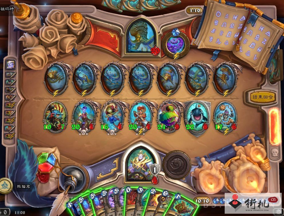 起手的打法很简单,111圣盾下去,看触须名字,有两根触须打死是可以降场攻的,先打那两个,总共有七根触须,有三根是2攻,打死特定的两根会把它降到0攻,先从这两根入手,降完攻等于对面场上多了三根电线杆。