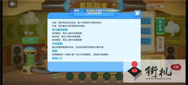 排位模式,休闲模式每个模式每天都可以拾取70能量,boss模式可以拾取40能量,加上任务的60能量一天可以获得240能量哦,因为安卓分享不了所以拿不到每天10的分享能量。九天就可以获得永久小黄车哦。