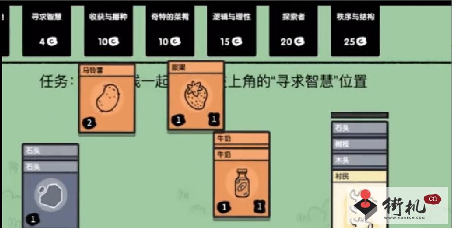 食物太多会占用我们的卡牌容量,在发展其他资源时很容易出现卡牌容量超出的情况,我们可以用“1木头+1石头+1树枝”制作棚子,1个棚子可以增加4个卡牌容量,这样不用担心食物太多不能放其他卡牌了。