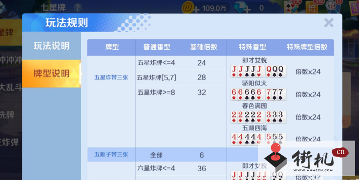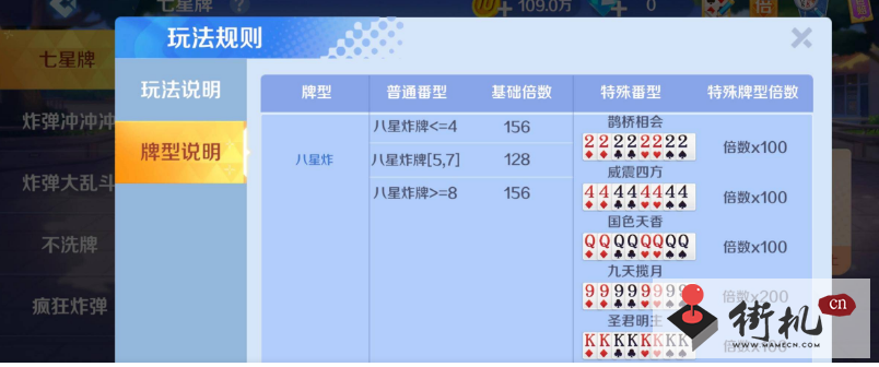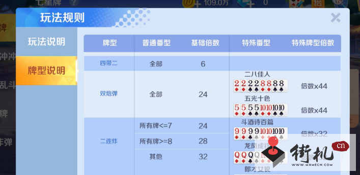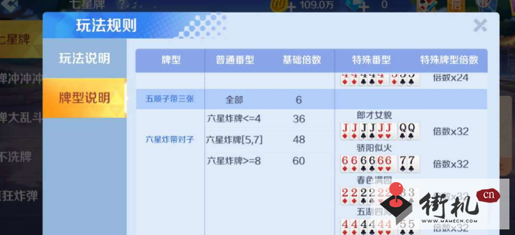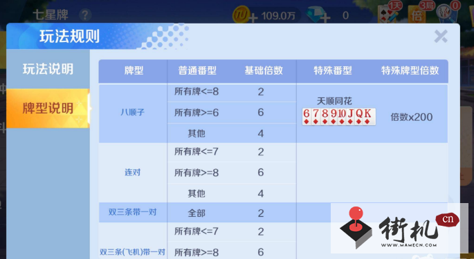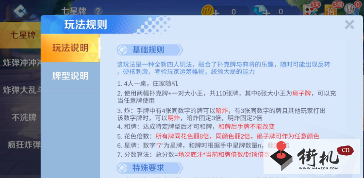1、七星牌是一种全新4人玩法,结合了扑克和麻将的乐趣,使用两幅扑克加一对大小王,共计110张牌,其中6张大小牌为癞子牌,可以当任何牌用。达成特定牌型后可以和牌,和牌后手牌不能改变