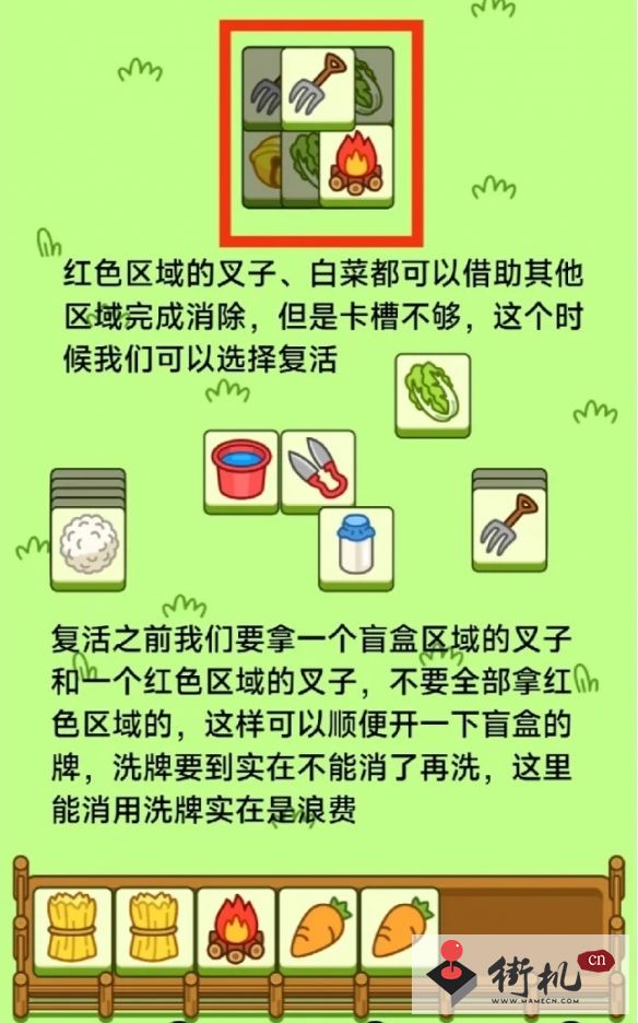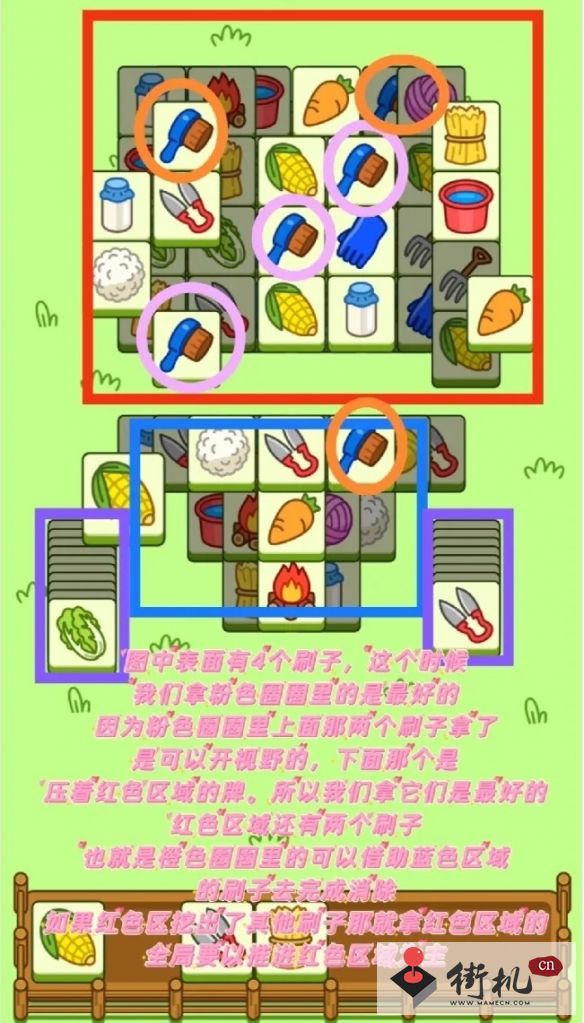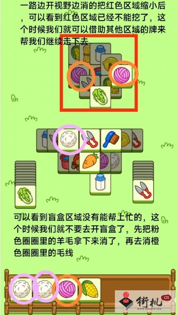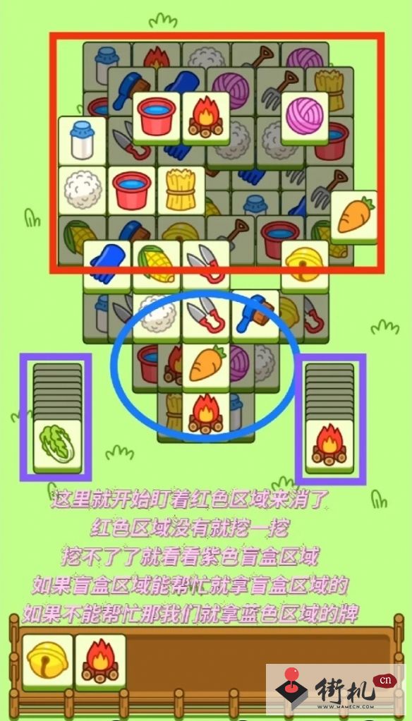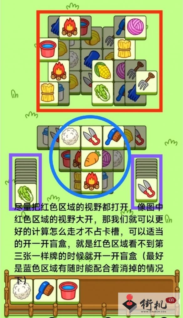 卡槽里牌少我们就挖红色区域能消的牌,卡槽里牌多,我们就利用非红色区域的牌清一下卡槽然后继续去挖红色区域的牌