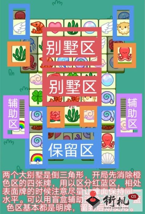 2.开局先消除橙色区里的牌,尽量让牌面保持在同一水平面,然后一层一层消除表面牌,不要跨层太多,等表面牌消除完后,以大别墅内互相消除为主。