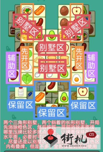 开局先消除橙色区的牌,这里压牌。尽量要让牌面保持在同一水平面,然后一层一层消除表面牌,不要跨层太多拿牌,等表面牌消除完后,以大别墅内互相消除为主。