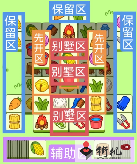 两个长形别墅,一个方形大别墅,开局先消除橙色区。这里压牌比较多,然后按照一层层均匀消除表面牌。让牌面保持在同水平面上。必要时可以用盲盒区辅助消除表面牌。尽量还是以别墅区内互相消除为主,蓝色区有叠牌,但是不多, 全部保留到后期使用。