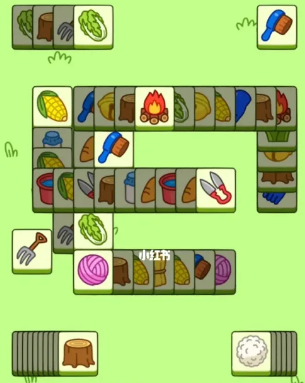 开局先把表面的玉米胡萝卜草能拿的都走掉,暂时消不了的不要往卡槽里拿。等开始乱的时候,我们在盲盒左右各下两张牌,去红色区域找牌清卡槽。