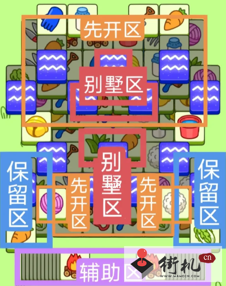 一个三角形大别墅,一个T字型别墅,开局先消除橙色区,然后按照一层层均匀消除表面牌,哪里压牌比较多就选点哪里。让牌面保持在同一水平面,必要时以用盲盒区辅助消除表面牌。尽量还是以别墅区内互相消除为主,蓝色区有叠牌,但是不多,全部保留到后期使用。