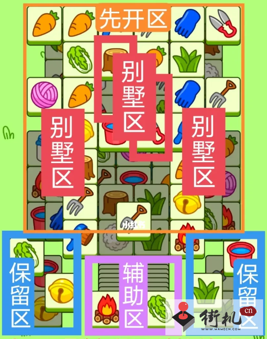 一个2+2+2叠牌大别墅,两个长形大别墅。开局先消除橙色区,然后按照一层层均匀消除表面牌,哪里压牌比较多就先消除哪里,必要时可以用盲盒区辅助消除表面牌,尽量还是以别墅区内互相消除为主,蓝色区有叠牌,但是不多,全部保留到后期使用。