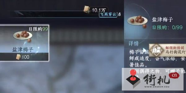 2、对话结束之后我们需要去购买盐津梅子,购买之后,我们根据任务的引导需要来到金明池把东西交给若霜后我们的任务也就完成了;