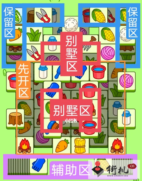 一个十字型大别墅,5个工字型大别墅,开局先消除橙色区。然后按照一层层均匀消除表面牌,哪里压牌此较多就先消除哪里,必要时可以用盲盒区辅助消除表面牌,尽量还是以别墅区内互相消除为主。蓝色区有叠牌,但是不多,全部保留到后期使用。