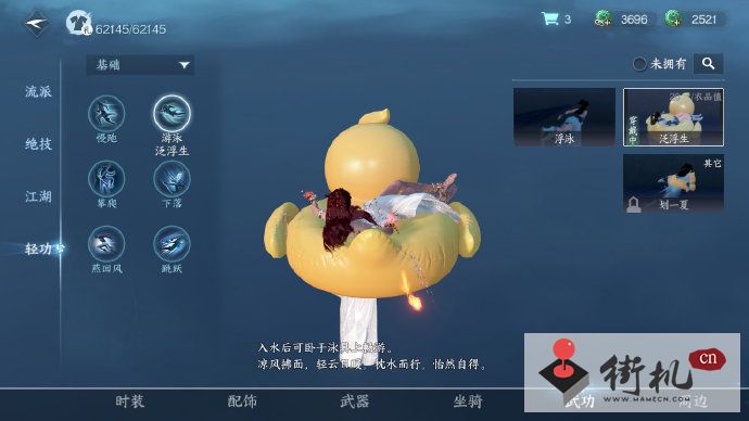 商城购买使用嘎嘎鸭礼盒后,在外观-武功-轻功-游泳界面,选择泛浮生,非小黄鸭游泳圈需要在配饰里戴上该外观,进入水域即可。