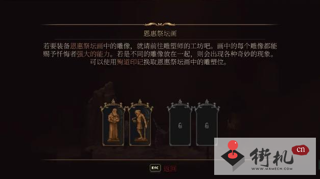3. 恩惠祭坛画是本作的主要强化系统,一共有8个槽位,两两为一对,玩家可以在其中放置雕像来获得对应的加成,需要注意的是在一组槽位中放置特定的雕像组合还能触发一些额外的效果,包括能够更改武器的攻击模式或是属性。