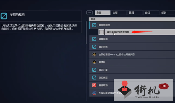 3、通过查阅任务我们能够知道,华纳请求我们去帮他找回丢失的数据板。